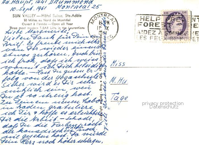 32984259 Quebec Sun Valley Hotel Suisse Ste-Adele postalisch gelaufen Erhaltung siehe scans [NatalD47] old postcard Nata Katcode 14110