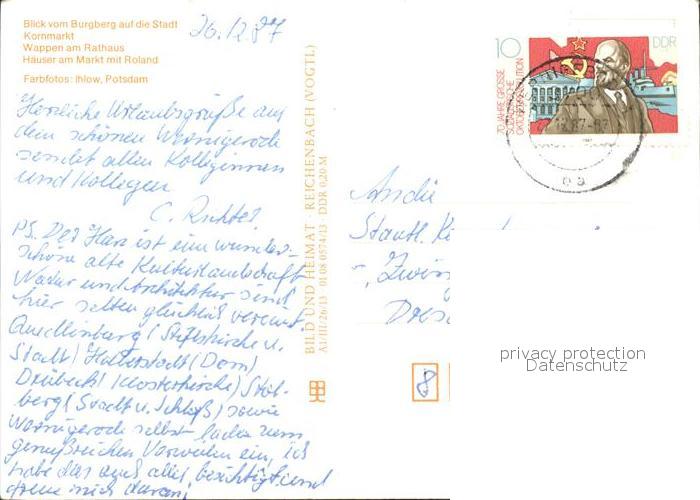 72356758 alte Postkarte Quedlinburg Harz Blick vom Burgberg Kornmarkt Wappen Rathaus Haeuser am Markt mit Roland postalisch gelaufen Erhaltung siehe scans KatCode: 11110015085235