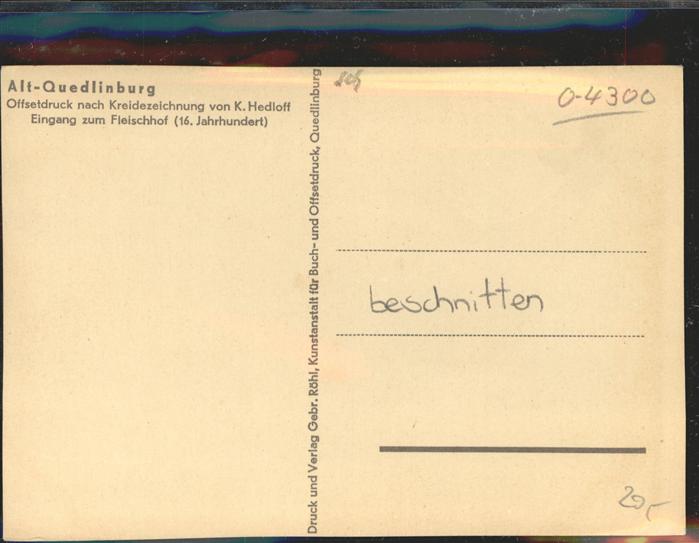 41347010 Quedlinburg Harz Eingang Fleischhof Kuenstlerkarte nach K. Hedloff postalisch nicht gelaufen Erhaltung mit Maengel Alte Ansichtskarte Postkarte hz_C Katcode 11110015085235