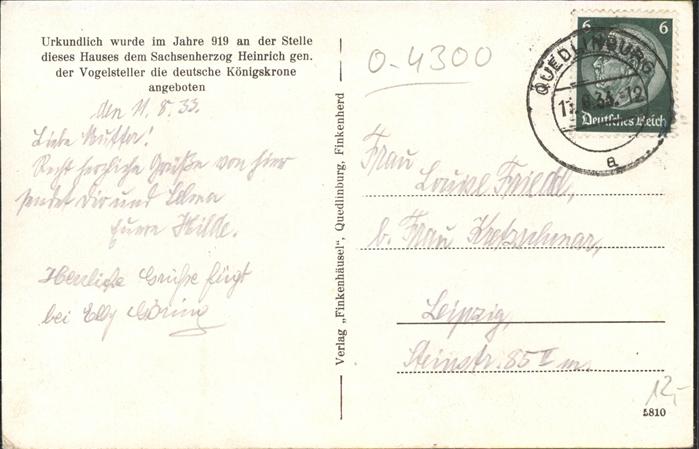41346950 Quedlinburg Harz Finkenherd postalisch gelaufen gute Erhaltung Alte Ansichtskarte Postkarte alte Postkarte hz_C Katcode 11110015085235