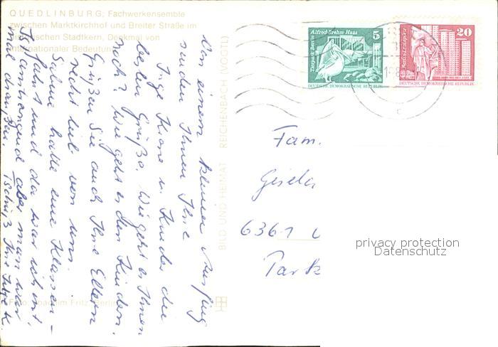 72505847 alte Postkarte Quedlinburg Harz Marktkirchhof Breite Strasse postalisch gelaufen Erhaltung siehe scans KatCode: 11110015085235