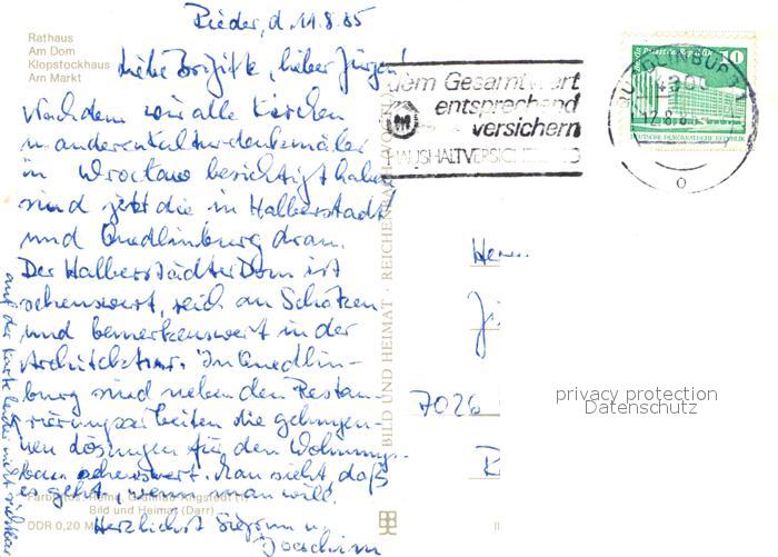 72972819 alte Postkarte Quedlinburg Harz Rathaus Dom Klopstockhaus Markt Altstadt Fachwerkhaeuser postalisch gelaufen Erhaltung siehe scans [FriedD77] KatCode: 11110015085235