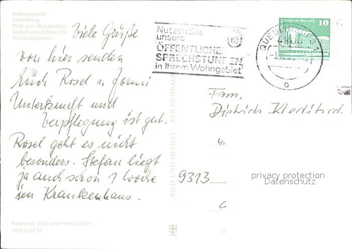 72371413 alte Postkarte Quedlinburg Harz Rathausportal Schlossberg Fachwerkhaeuser Muenzenberg Schloss Stiftskirche Wordplatzgarten postalisch gelaufen Erhaltung siehe scans KatCode: 11110015085235