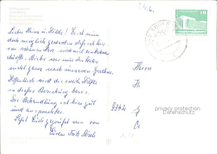 72372283 alte Postkarte Quedlinburg Harz Rathausportal Schlossberg Muenzenberg Schloss Stiftskirche Wordplatzgarten postalisch gelaufen Erhaltung siehe scans KatCode: 11110015085235