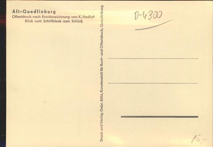 41347028 Quedlinburg Harz Schiffbleek Schloss Kuenstlerkarte nach K. Hedloff postalisch nicht gelaufen gute Erhaltung Alte Ansichtskarte Postkarte hz_C Katcode 11110015085235