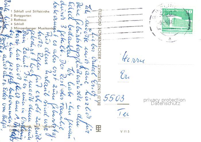 73038350 alte Postkarte Quedlinburg Harz Schloss Stiftskirche Burggarten Rathaus Muenzenberger Musikanten postalisch gelaufen Erhaltung siehe scans [KathaD81] KatCode: 11110015085235