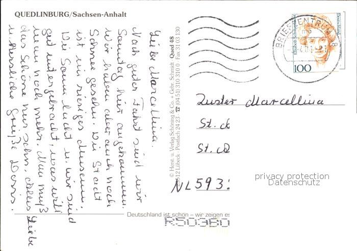 72449364 alte Postkarte Quedlinburg Harz Skulptur Markt Kirche Fachwerkhaeuser Brunnen postalisch gelaufen Erhaltung siehe scans KatCode: 11110015085235