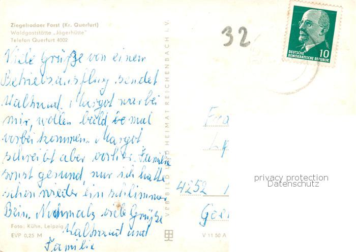 73787238 Querfurt Sachsen-Anhalt Ziegelrodaer Forst Waldgaststaette Jaegerhuette postalisch gelaufen Erhaltung siehe scans [WerneD78] alte Postkarte Wern Katcode 11110015088305