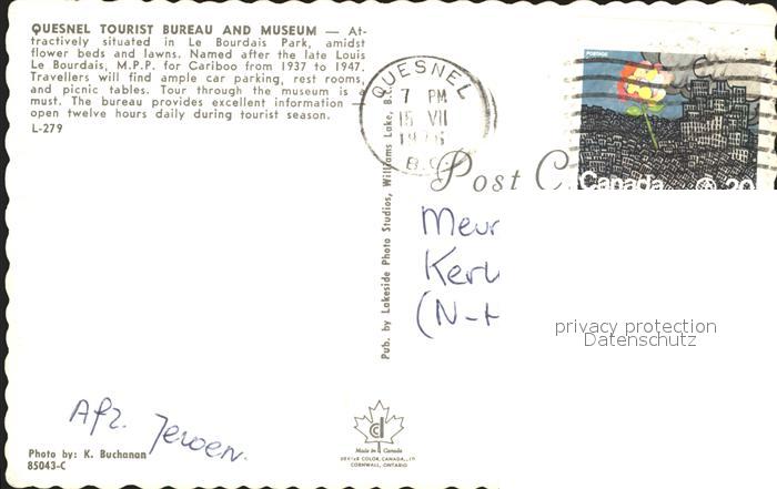 old postcard Quesnel Tourist Bureau Museum postalisch gelaufen Erhaltung siehe scans