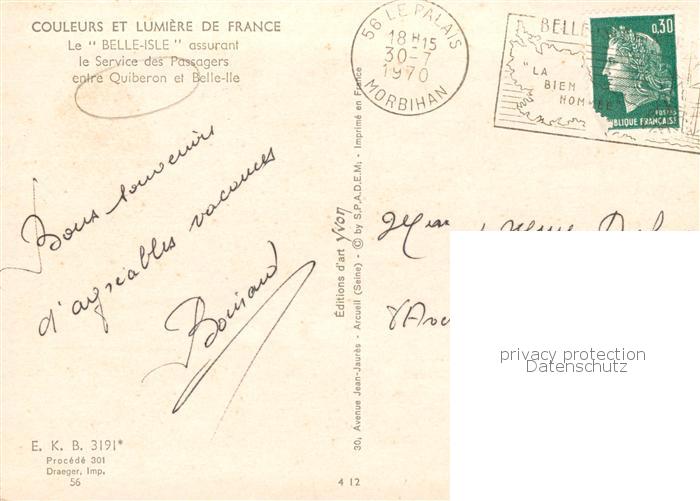 13790585 Quiberon 56 Morbihan Le Belle-Isle assurant le Service des Passagers entre Quiberon et Belle-Ile postalisch gelaufen Erhaltung siehe scans [WerneD78] carte postale Wern Katcode 11170056156186