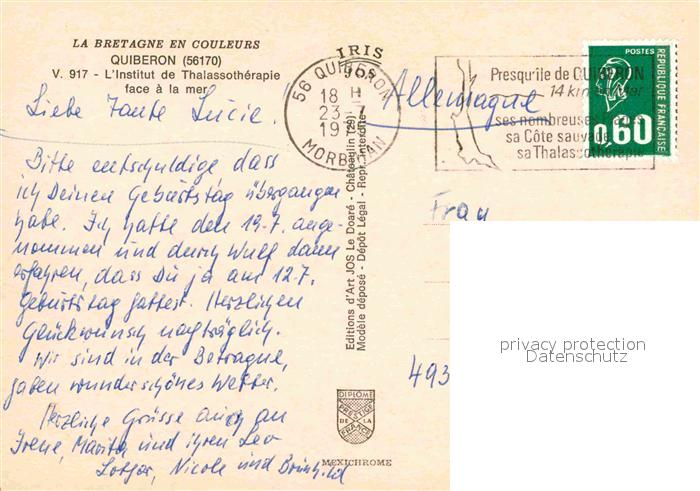 12836341 carte postale Quiberon Morbihan Institut Thalassotherapie face a la mer postalisch gelaufen Erhaltung siehe scans [NatalD47] KatCode: 11170056156186