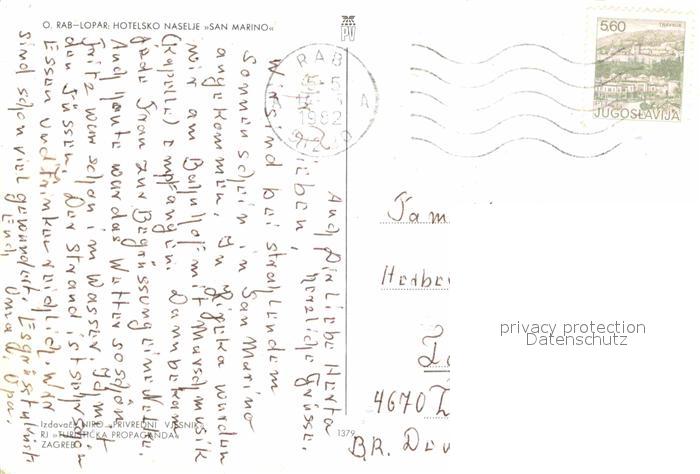 old postcard Rab Croatia Hotelsko Naselje San Marion Strand postalisch gelaufen Erhaltung siehe scans [LiesaD40]