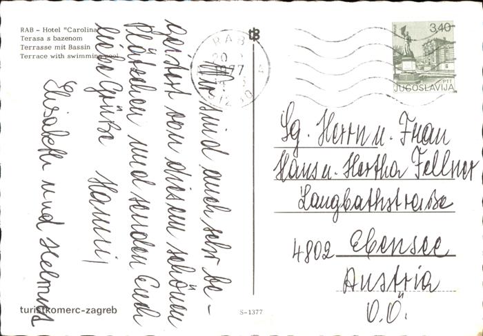 old postcard Rab Kroatien Hotel Carolina Terrasse Swimming Pool postalisch gelaufen Erhaltung siehe scans