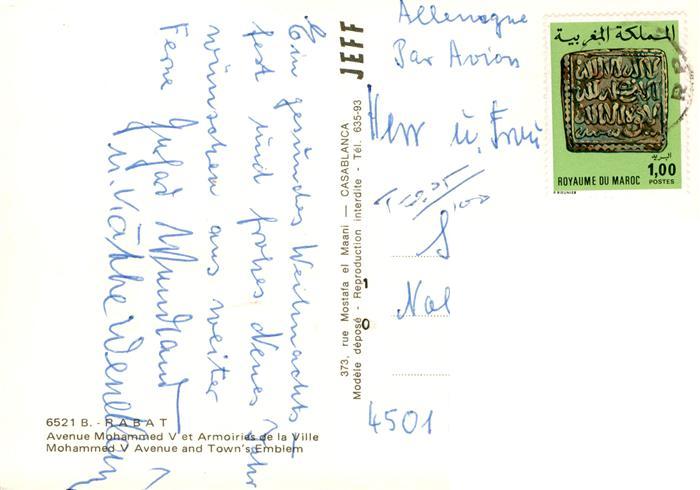 73905689 old postcard Rabat Maroc Avenue Mohammed V et Armoiries de la Ville postalisch gelaufen Erhaltung siehe scans [WerneD78] KatCode: 18300