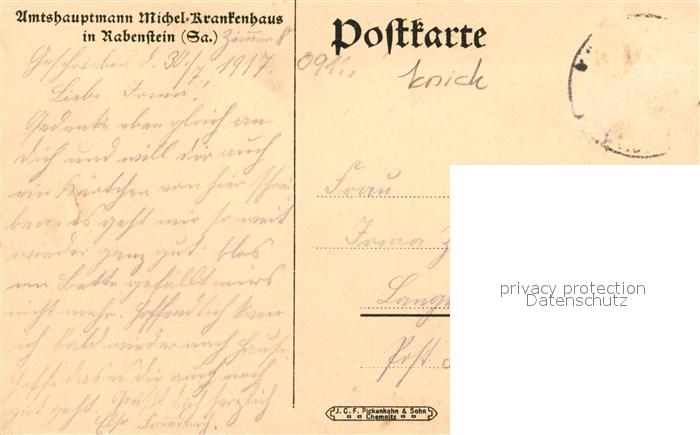 43075532 alte Postkarte Rabenstein Chemnitz Amtshauptmann Michel Krankenhaus postalisch gelaufen Erhaltung siehe scans [FriedD77] KatCode: 11110014161000
