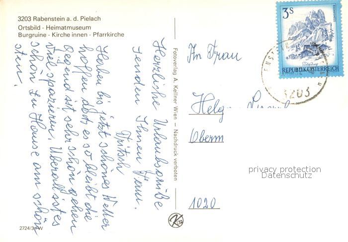 73653785 alte Postkarte Rabenstein Pielach Ortsbild mit Kirche Heimatmuseum Burgruine Pfarrkirche Innenansicht postalisch gelaufen Erhaltung siehe scans [FriedD77] KatCode: 11390