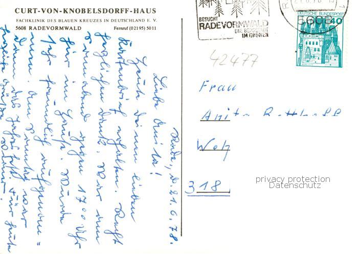 73865471 alte Postkarte Radevormwald Curt von Knobelsdorff Haus Fachklinik des Blauen Kreuzes postalisch gelaufen Erhaltung siehe scans [FriedD77] KatCode: 11110005374036