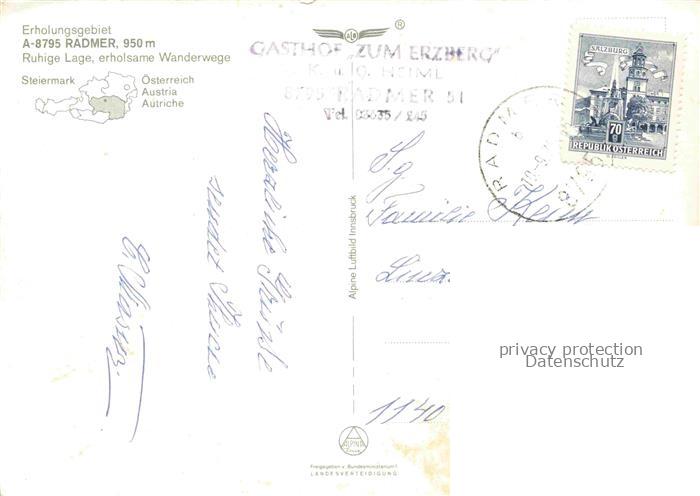 74156375 alte Postkarte Radmer Steiermark AT Lugauer Tal Dorf Bergwiesen Wald Berggipfel Gasthof-zum-Erzberg Fliegeraufnahme postalisch gelaufen Fliegeraufnahme Erhaltung siehe scans [Karloger] KatCode: 11390223061112