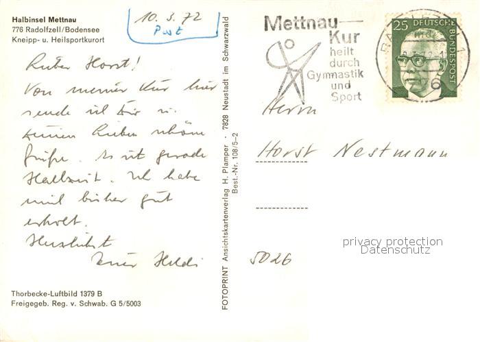 73687474 alte Postkarte Radolfzell Bodensee Halbinsel Mettnau Fliegeraufnahme postalisch gelaufen Erhaltung siehe scans [FriedD77] KatCode: 11110008335063