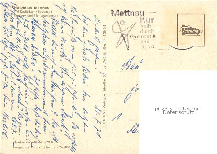 72937297 alte Postkarte Radolfzell Bodensee Halbinsel Mettnau Fliegeraufnahme postalisch gelaufen Erhaltung siehe scans [WerneD78] KatCode: 11110008335063
