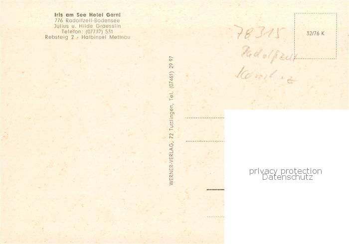 73854664 Radolfzell Bodensee Hotel Garni Iris am See postalisch nicht gelaufen Erhaltung siehe scans [FriedD77] KatCode: 11110008335063