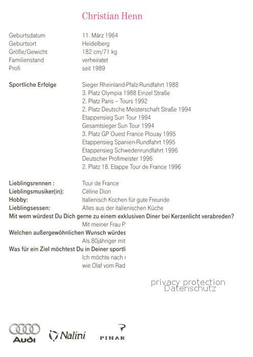 Radsport Radrennfahrer Christian Henn Autogramm Telekom postalisch nicht gelaufen Keine Postkarte (siehe scan) Erhaltung siehe scans [PaolaD17]