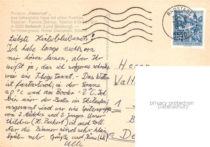 73586735 alte Postkarte Radstadt Pension Felserhof postalisch gelaufen Erhaltung siehe scans [PaolaD17] KatCode: 11390322050417
