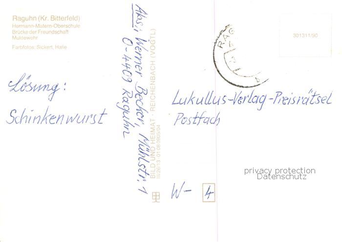 73813282 alte Postkarte Raguhn Hermann Matern Oberschule Bruecke der Freundschaft Muldewehr postalisch gelaufen Erhaltung siehe scans [WerneD78] KatCode: 11110015082300