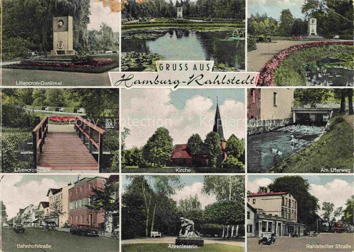 74109941 alte Postkarte Rahlstedt HAMBURG Liliencron Denkmal und Park Weiher Park Kirche Uferweg Bahnhofstrasse aehrenleserin Rahlstedter Strasse postalisch gelaufen Erhaltung siehe scans [WerneD78] KatCode: 11110002000000