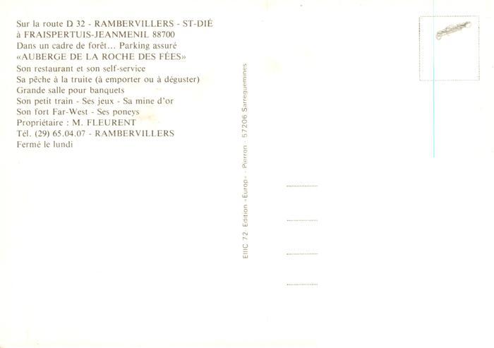 13946592 Rambervillers 88 Vosges St Die a Fraispertuis Jaenmenil Dans un cadre de foret Parking assure Auberge de la Roche des Fees postalisch nicht gelaufen Erhaltung siehe scans [WerneD78] Wern Katcode 11170088188367