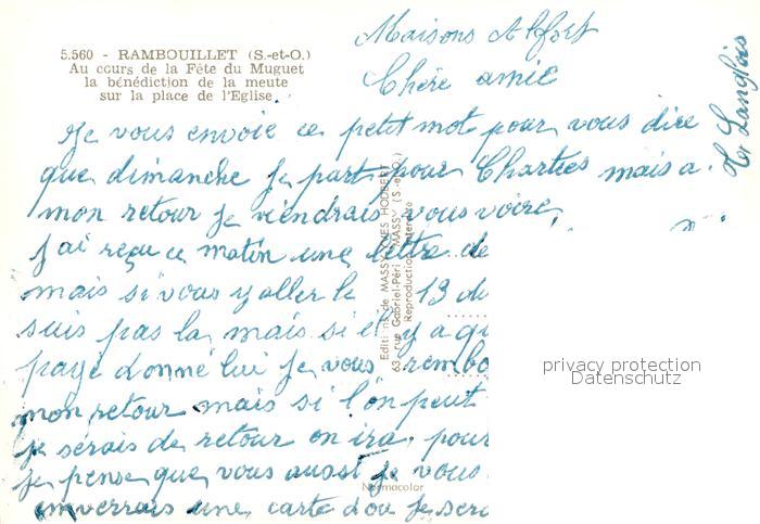 13593884 Rambouillet Au cours de la Fete du Muguet la benediction de la meute sur la place de l’Eglise postalisch nicht gelaufen Erhaltung siehe scans [WerneD78] Wern Katcode 11170078278517