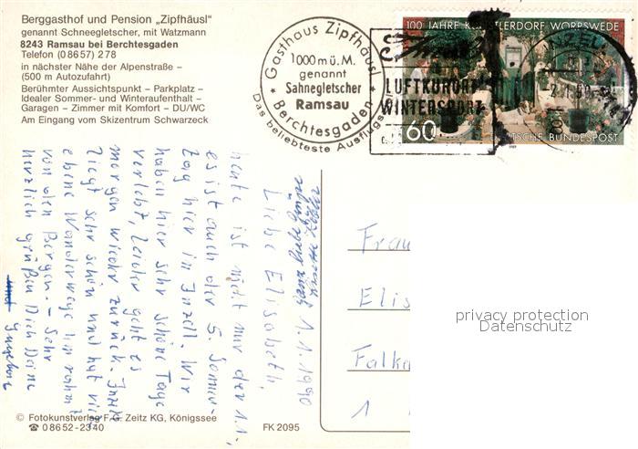 73174044 alte Postkarte Ramsau Berchtesgaden Berggasthof Pension Zipfhaeusl genannt Sahnegletscher mit Watzmann Berchtesgadener Alpen postalisch gelaufen Erhaltung siehe scans [FriedD77] KatCode: 11110009172129