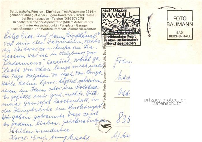 73174048 alte Postkarte Ramsau Berchtesgaden Berggasthof Pension Zipfhaeusl mit Watzmann Berchtesgadener Alpen postalisch gelaufen Erhaltung siehe scans [FriedD77] KatCode: 11110009172129