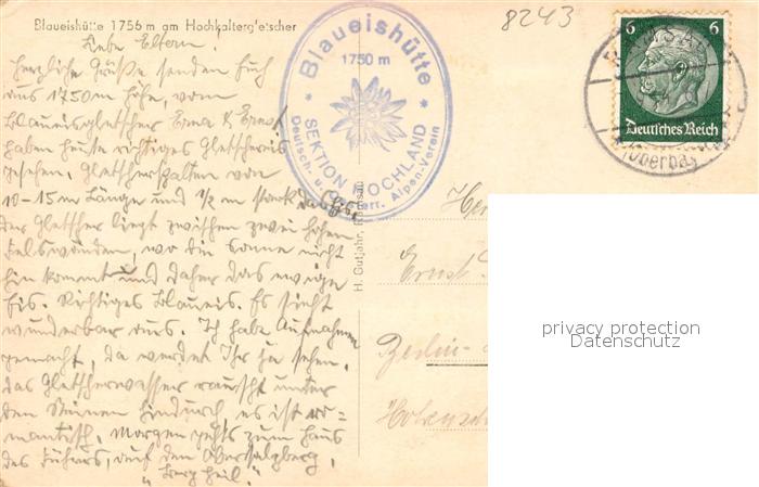 43496310 alte Postkarte Ramsau Berchtesgaden Blaueishuette am Hochkaltergletscher Alpen postalisch gelaufen Erhaltung siehe scans [FriedD77] KatCode: 11110009172129