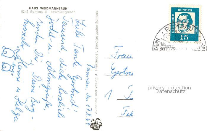 43496243 alte Postkarte Ramsau Berchtesgaden Gaestehaus Pension Haus Weidmannsruh Alpenblick postalisch gelaufen Erhaltung siehe scans [FriedD77] KatCode: 11110009172129