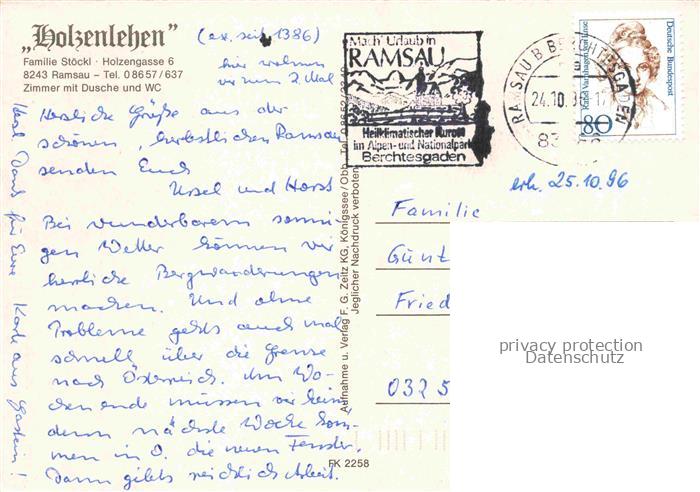 74043613 alte Postkarte Ramsau Berchtesgaden Gaestehaus Pension Holzenlehen Gastraum Fremdenzimmer Partie am Fluss Blick zur Kirche Alpen postalisch gelaufen Erhaltung siehe scans [FriedD77] KatCode: 11110009172129