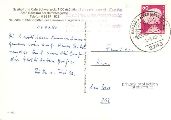 72925609 alte Postkarte Ramsau Berchtesgaden Gasthof Schwarzeck Skizentrum postalisch gelaufen Erhaltung siehe scans [NatalD47] KatCode: 11110009172129