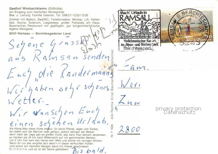 72673066 alte Postkarte Ramsau Berchtesgaden Gasthof Wimbachklamm postalisch gelaufen Erhaltung siehe scans [AndreD76] KatCode: 11110009172129