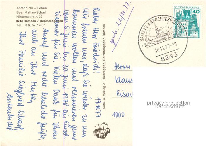 73724713 alte Postkarte Ramsau Berchtesgaden Haus Antenbichl Gaestehaus Pension Alpen postalisch gelaufen Erhaltung siehe scans [FriedD77] KatCode: 11110009172129