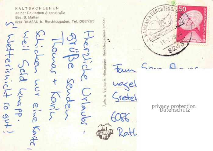 74043778 alte Postkarte Ramsau Berchtesgaden Kaltbachlehen an der Deutschen Alpenstrasse postalisch gelaufen Erhaltung siehe scans [FriedD77] KatCode: 11110009172129
