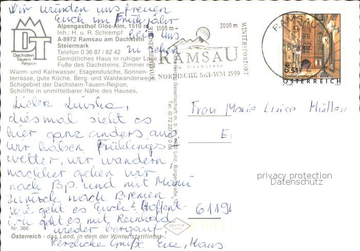 71962537 alte Postkarte Ramsau Dachstein Steiermark Alpengasthof Gloes-Alm postalisch gelaufen Erhaltung siehe scans KatCode: 11390222061236