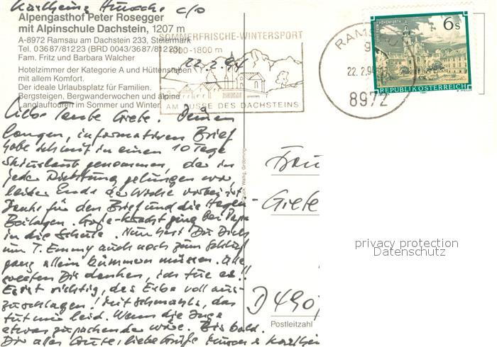 73688721 alte Postkarte Ramsau Dachstein Steiermark Alpengasthof Peter Rosegger mit Alpinschule Skikurs Wintersportplatz Alpen postalisch gelaufen Erhaltung siehe scans [FriedD77] KatCode: 11390222061236