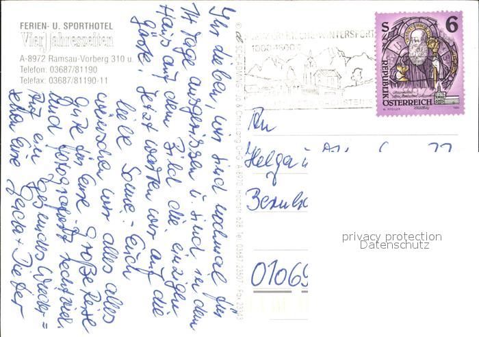 72407003 alte Postkarte Ramsau Dachstein Steiermark Ferien und Sporthotel Vier Jahreszeiten postalisch gelaufen Erhaltung siehe scans KatCode: 11390222061236