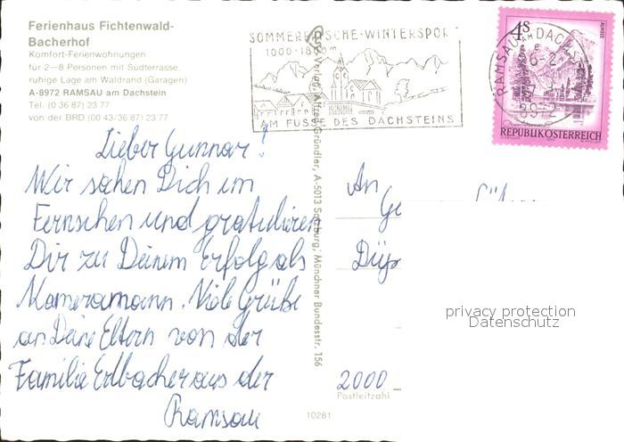 72048139 alte Postkarte Ramsau Dachstein Steiermark Ferienhaus Fichtenwald Bacherhof postalisch gelaufen Erhaltung siehe scans KatCode: 11390222061236