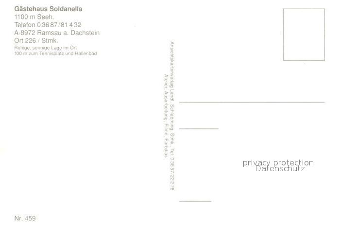 73070806 Ramsau Dachstein Steiermark Gaestehaus Haus Soldanelle postalisch nicht gelaufen Erhaltung siehe scans [FriedD77] KatCode: 11390222061236