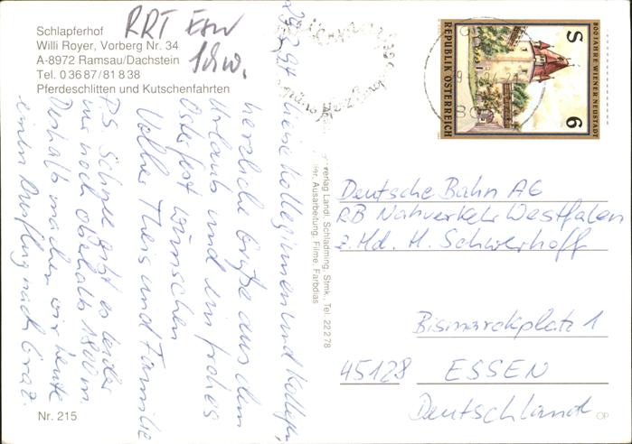 71431710 alte Postkarte Ramsau Dachstein Steiermark Gasthaus Schlapferhof Pferdeschlitten Kutschfahrten postalisch gelaufen Erhaltung siehe scans KatCode: 11390222061236