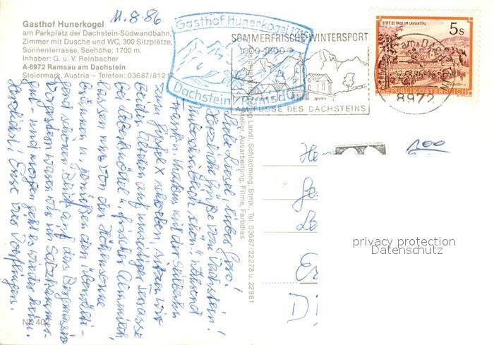 73070809 alte Postkarte Ramsau Dachstein Steiermark Gasthof Hunerkogel Dachstein Suedwandbahn postalisch gelaufen Erhaltung siehe scans [FriedD77] KatCode: 11390222061236