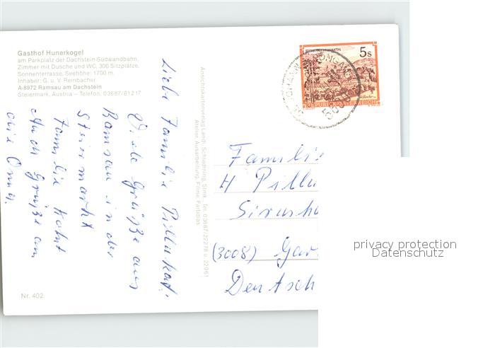 72081034 alte Postkarte Ramsau Dachstein Steiermark Gasthof Hunerkogel Terrasse postalisch gelaufen Erhaltung siehe scans KatCode: 11390222061236