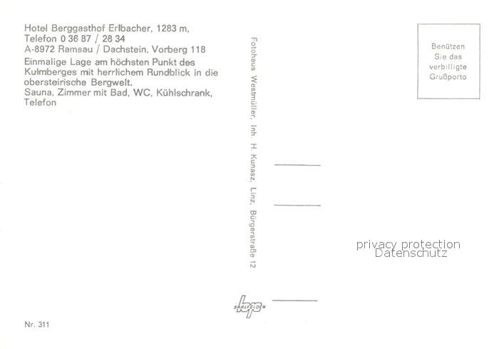 73082754 Ramsau Dachstein Steiermark Hotel Berggasthof Erlbacher postalisch nicht gelaufen Erhaltung siehe scans [LiesaD40] KatCode: 11390222061236