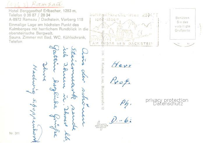 73592393 alte Postkarte Ramsau Dachstein Steiermark Hotel Berggasthof Erlbacher Dachsteingebirge Panorama Bergwelt postalisch gelaufen Erhaltung siehe scans [FriedD77] KatCode: 11390222061236